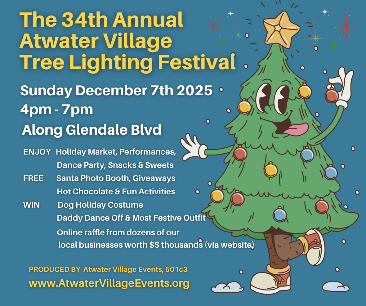 Powered by volunteers, we produce & promote events strengthening community + supporting local businesses in and around Atwater Village. Our flagship event is the Annual Atwater Village Tree Lighting Festival.